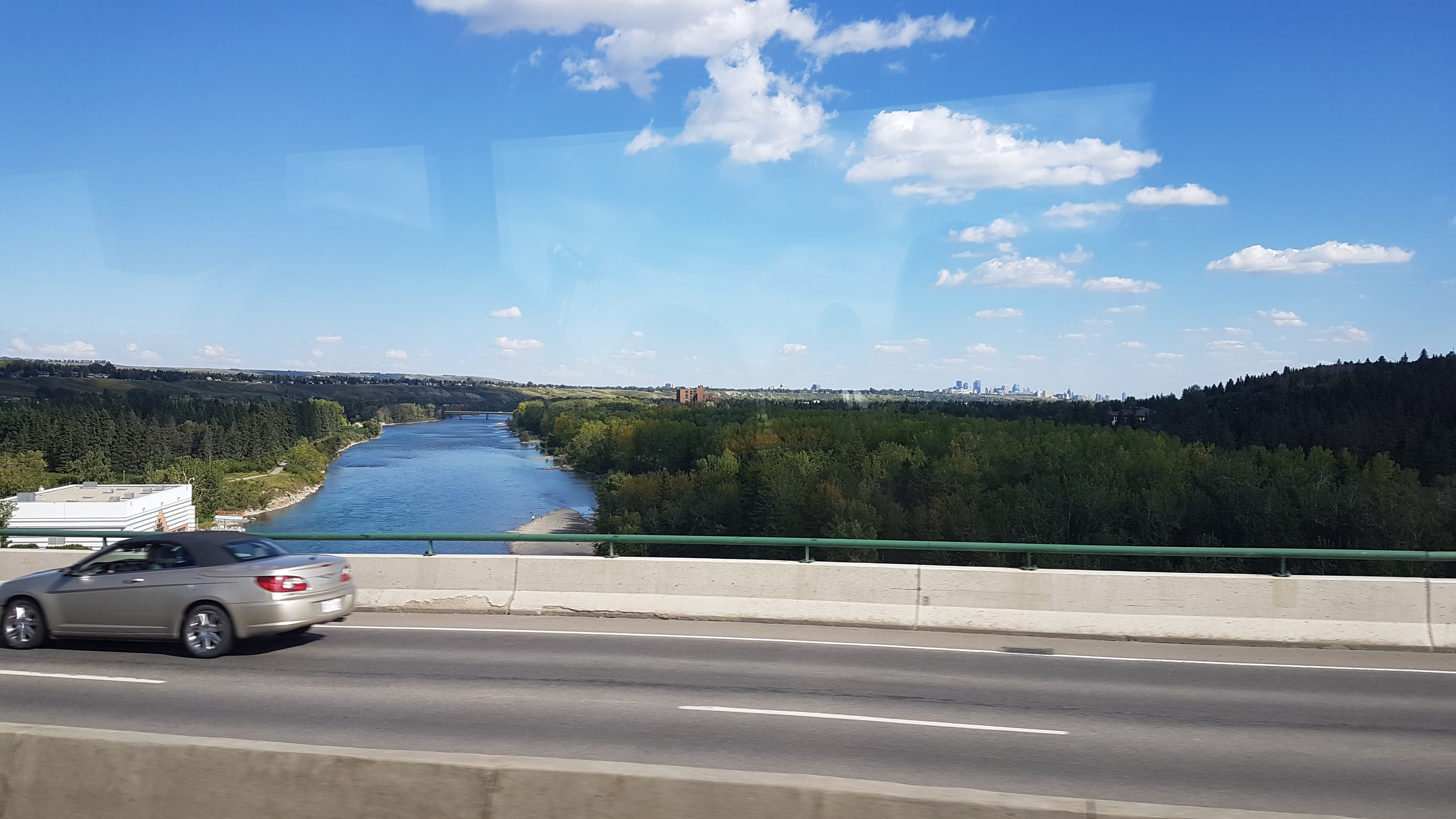 Mit einer halben Stunde Verspätung sind wir dann in Calgary gelandet. Noch 1h30 bis der Bus nach Banff geht. Also sind wir schnell weiter um den Prozess unserer Einreise zu durchlaufen. Da wir unsere Arbeitserlaubnis auch noch abholen mussten, sind wir danach direkt an den Gepäckbändern vorbei zum „Immigration Centre“, wobei ich der Meinung war, dass ich meinen Rucksack auf dem Gepäckband bereits gesehen hatte. Während wir dann darauf warteten, dass wir dran kommen um unsere Arbeitserlaubnis abzuholen, ging unser nervöser Blick immer wieder zur Uhr. Würden wir unseren Bus nach Banff noch bekommen? Zwischendurch hatten wir überlegt ob es nicht doch schlauer gewesen wäre erst das Gepäck zu holen. Als wir dann unser „Work Permit“ hatten war es bereits 15h20 und wir waren uns echt nicht sicher ob wir den Bus noch bekommen würden. Schließlich mussten wir zuerst zu dem Schalter der Busgesellschaft. Als wir raus kamen zeigten uns glücklicherweise schnell ein paar Mitarbeiter den Weg, jedoch lagen zwischen uns und dem Schalter einige Ausgänge, also ein weiter Weg. Von Tür 17 (oder so) bis zu Tür 5. Als wir das merkten begannen wir zu rennen, glücklicher Weise, wirklich, wir hatten so viel Glück in diesem Moment, kam uns eine Frau auf einem Flughafen-Shuttle entgegen. Ein Mann saß drin, doch der Stieg sofort aus als er uns sah und beide fragten wo wir denn hin müssten. Wir nannten ihnen den Namen der Busgesellschaft und die Frau fuhr uns dorthin. Die Frau an dem Schalter sah meinen Namen und fragte ob ich Spanisch spreche, dann erklärte sie uns wie wir zu dem Bus kommen. Da es praktisch schon 15h30 war rannten wir schnell zum Bus und kamen gerade noch pünktlich. Wenn nur ein Detail länger gedauert hätte, dann hätten wir unseren Bus wohl verpasst. Unser Gepäck hatten wir sofort gefunden, weil auch nicht mehr viele Gepäckstücke drauf lagen.