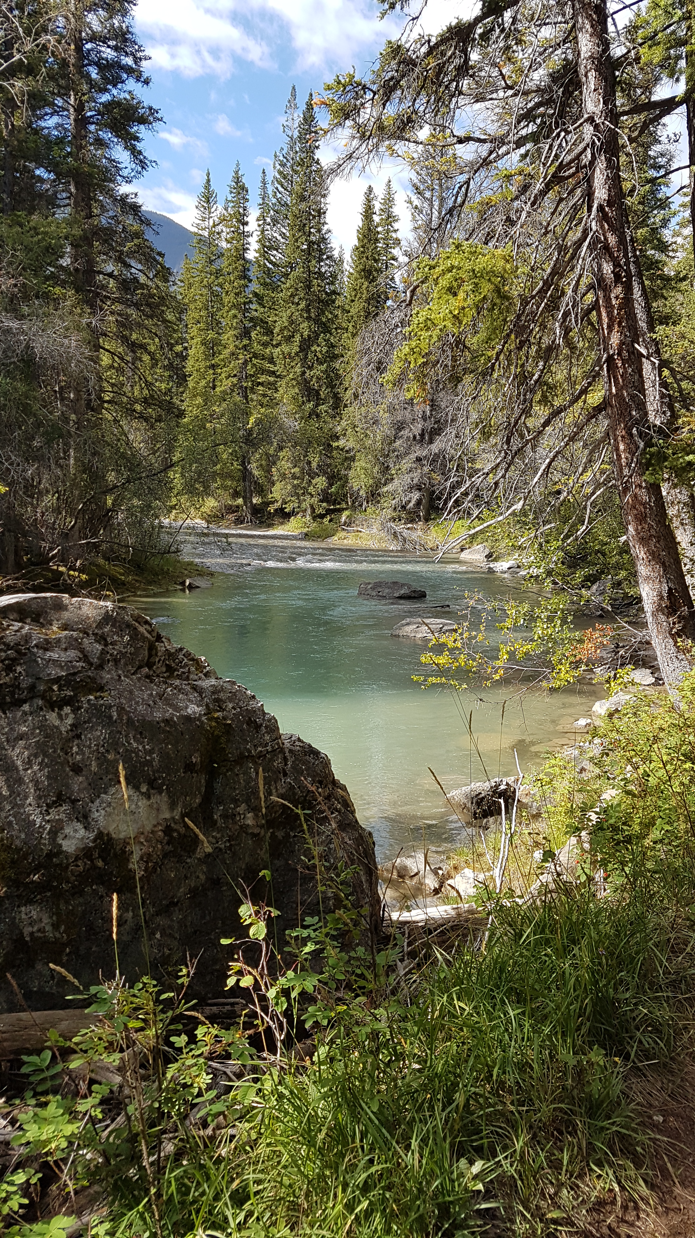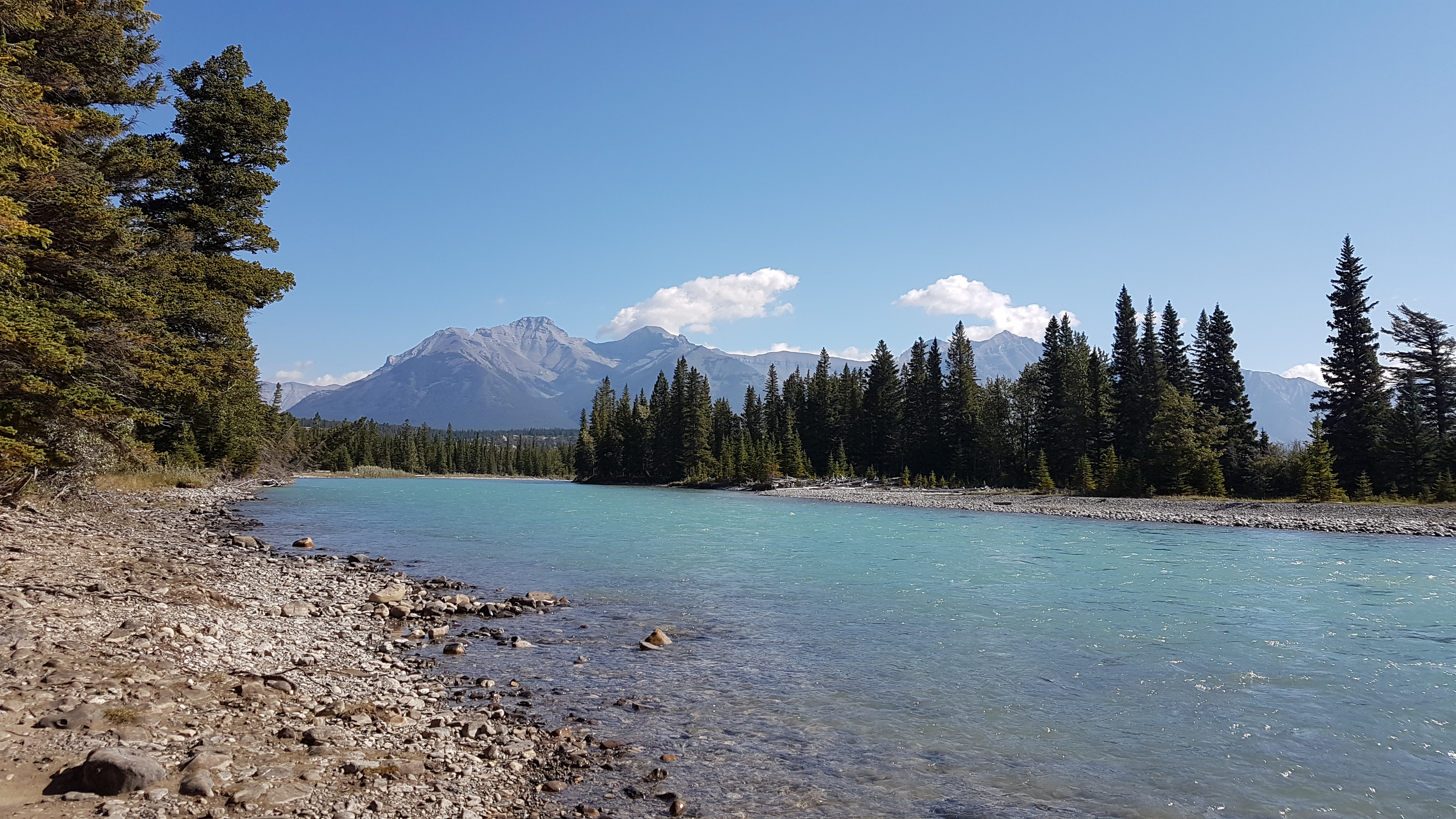 Dann kehrten wir zurück in die Stadt, denn unser Plan war noch auf den Sulphur Mountain zu wandern, um von dort mit einer Gondel hinunter zu fahren. Zur Stärkung deckten wir uns im Supermarkt mit Bagels und Tzatziki und Bananen ein, was wir sofort bei einem Picknick am Fluss aufaßen.