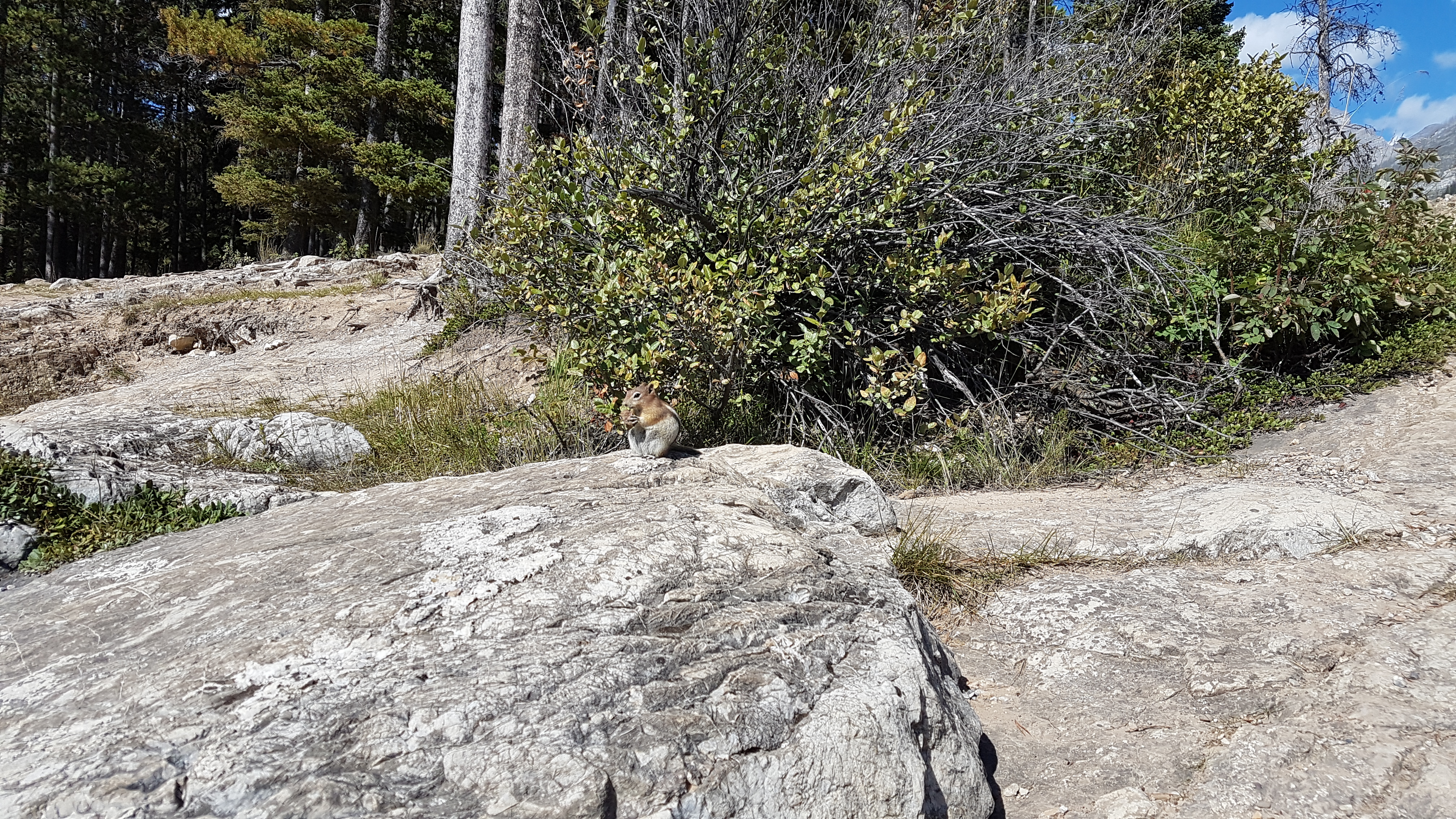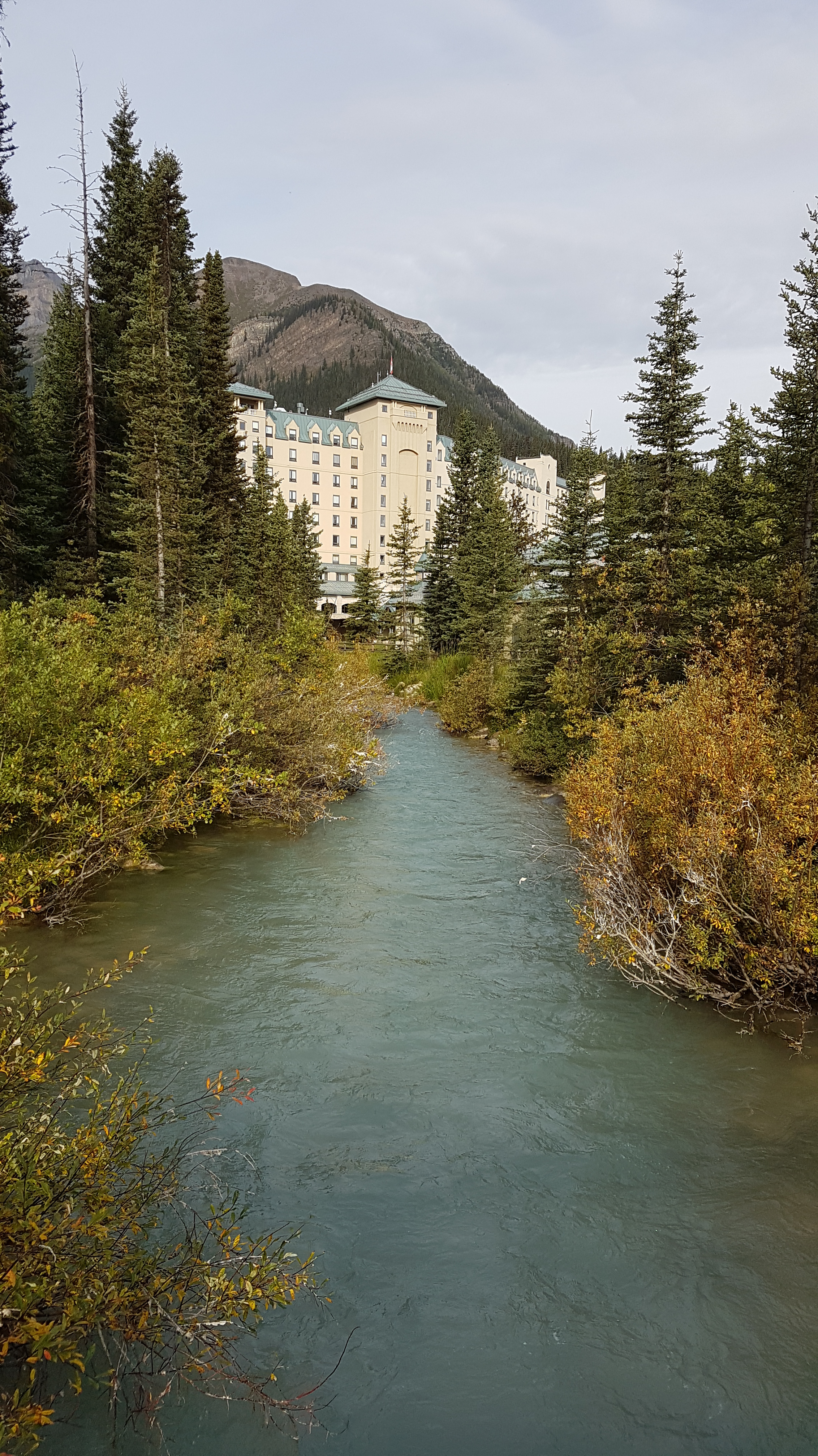 Und damit haben wir gleich begonnen. Wir sind durch den Wald, in einem Schlenker, bis zur Innenstadt gelaufen. Dabei sind uns sofort die Streifenhörnchen aufgefallen, wobei wir zunächst dachten, dass das Geräusch das von den Streifenhörnchen kam, eigentlich von Vögel käme. Wir sind an einem wunderschönen Fluss entlang gelaufen, bis wir am Ende auf ein ziemlich bekanntes Hotel, das Banff Springs Hotel, gestoßen sind. Sehr beeindruckend wie es so majestätisch mitten auf dem Berg steht.