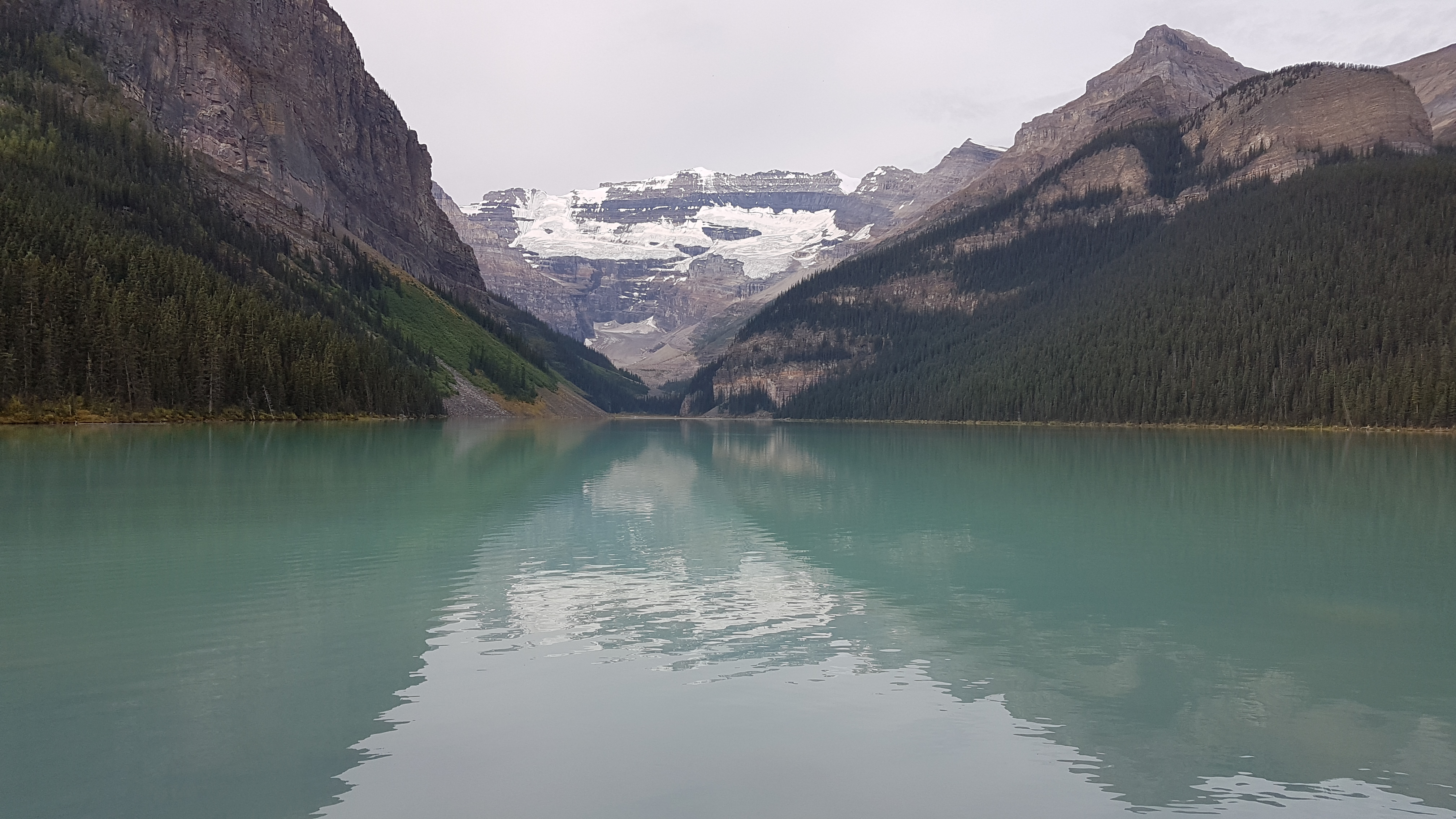 Am Ende der Busfahrt erwartete uns Lake Louise in voller Pracht! Mitten in den Bergen, vor Gletschern und daneben ein märchenhaftes Schlosshotel.