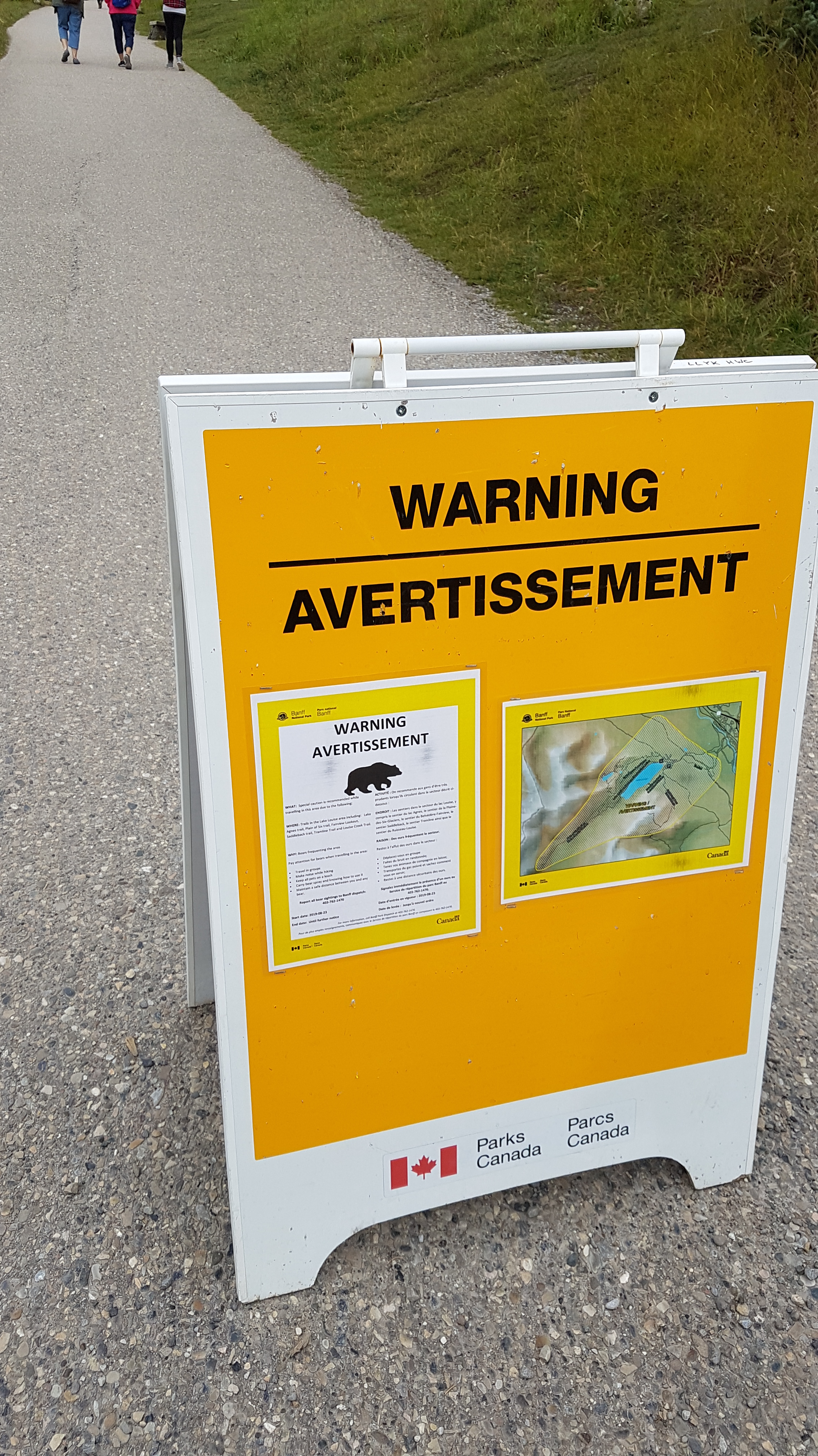 Nach dem wir uns dieses wunderschöne Naturereignis erst einmal eine Weile angeguckt hatten, fragten wir bei der Information nach, was wir denn am besten, in der Zeit die wir hatten, unternehmen könnten. Uns wurde eine Wanderung hinauf zu einem kleinen Teehaus empfohlen (Es liegt ungefähr rechts von der runden Berg „-spitze“). Diese Wanderung den Berg hinauf traten wir also an, wobei uns direkt am Anfang des Weges wieder eine Bärenwarnung stand.