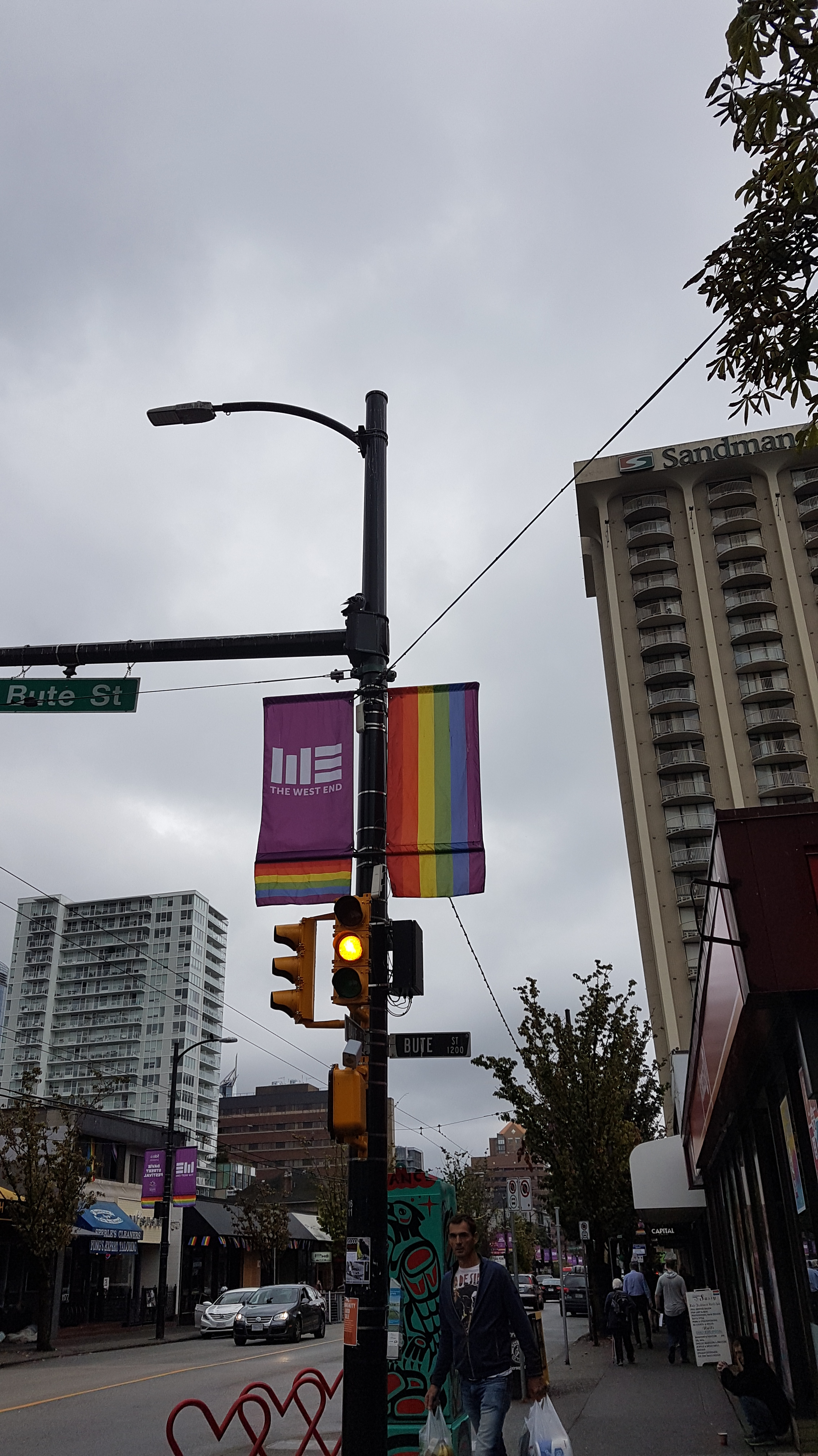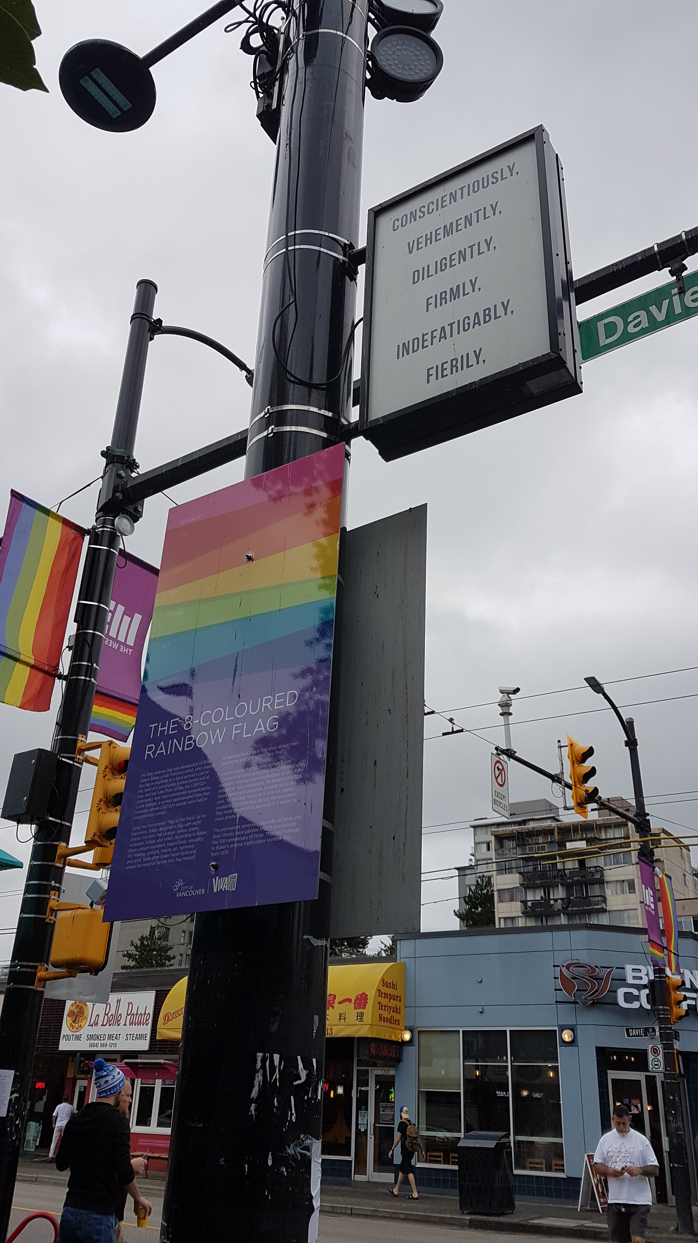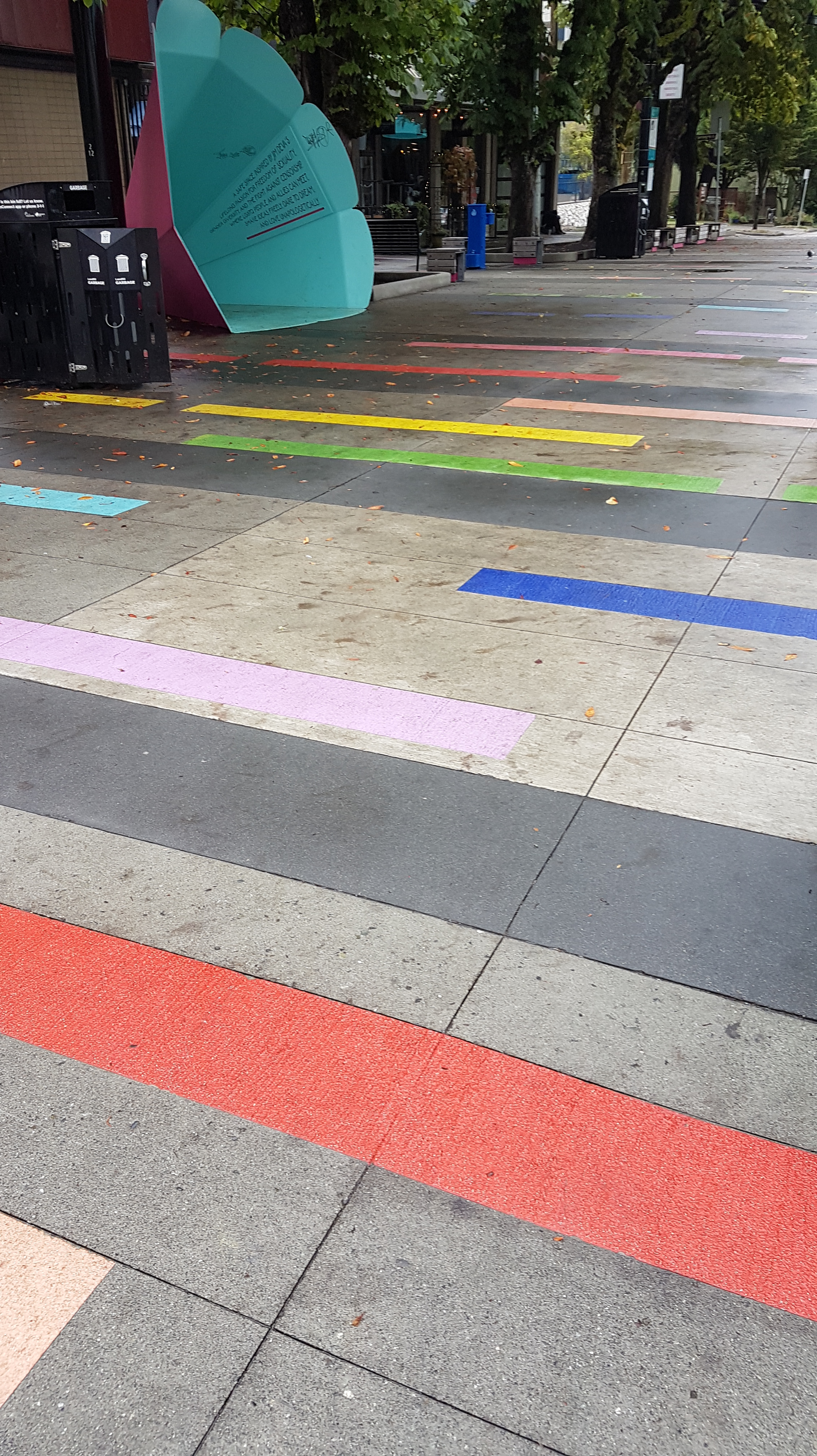 Wir spazierten die Davie Street hinunter, unser Ziel, der Granville Island Public Market. Die Straße war voller Regenbögen, überall.